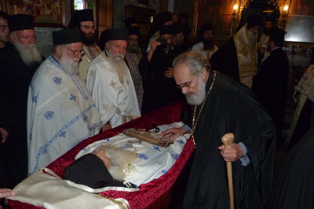 Από χθες το βράδυ μεταφέρθηκε το σκήνωμα του στο Μητροπολιτικό Ναό το οποίο συνόδευσε ο Αρχιεπίσκοπος Κρήτης Ειρηναίος και Ιεράρχες της Εκκλησίας Κρήτης και κληρικοί. Την Παρασκευή το πρωί τελέστηκε Θεία Λειτουργία, ενώ στις 6 το απόγευμα θα τελεσθεί Εσπερινός, χοροστατούντος του μητροπολίτη Ρεθύμνης και Αυλοποτάμου Ευγένιου. Στη συνέχεια, προεξάρχοντος του κ. Ευγένιου, θα ψαλεί η Ιερά Ακολουθία εις εκδημήσαντας Μοναχούς και Επισκόπους και θα ακολουθήσει στις 23.00 Νυχτερινή Θεία Λειτουργία.Το Σάββατο 17 Οκτωβρίου στις 7 π.μ. θα τελεσθεί τρισαρχιερατικό Συλλείτουργο, ιερουργούντων του Αρχιεπισκόπου Κρήτης, Τοποτηρητή της Ιεράς Μητροπόλης Πέτρας και Χερρονήσου, Ειρηναίου, του Μητροπολίτη Ιεραπύτνης και Σητείας Ευγενίου και του Μητροπολίτη Αρκαλοχωρίου, Καστελίου και Βιάννου Ανδρέα.