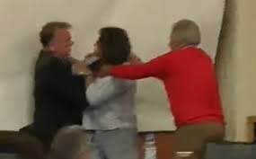 Οι δύο άνδρες άρχισαν να σπρώχνουν ο ένας τον άλλο μπροστά στα μάτια των έκπληκτων συναδέλφων τους και να παλεύουν μεταξύ τους. Δημοτικοί σύμβουλοι μπήκαν στη μέση για να τους χωρίσουν ενώ η συνεδρίαση διεκόπη προκειμένου να ηρεμήσουν τα πνεύματα.