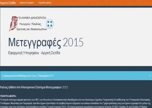Η προθεσμία για τις αιτήσεις για μετεγγραφές φοιτητών θα λήξει στις 13 Νοεμβρίου 2015. Οι ενδιαφερόμενοι φοιτητές, θα μπορούν να επισκέπτονται την ειδική εφαρμογή μετεγγραφών, η οποία βρίσκεται στην ηλεκτρονική διεύθυνση transfer.it.minedu.gov.gr (ή εναλλακτικά μέσω της ιστοσελίδας του Υπουργείου). Με αυτό τον τρόπο θα μπορούν να υποβάλουν ηλεκτρονικά την αίτησή τους. Για να μπουν στην συγκεκριμένη ηλεκτρονική εφαρμογή, οι αιτούντες φοιτητές θα πρέπει να χρησιμοποιήσουν το όνομα χρήστη (username) και τον κωδικό (password) που τους έχει χορηγηθεί από τη Γραμματεία της Σχολής ή του Τμήματός στο οποίο φοιτούν.
