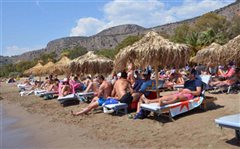 Ξαπλώστρες καταλαμβάνουν κάθε εκατοστό άμμου, καντίνες με ηχεία...
