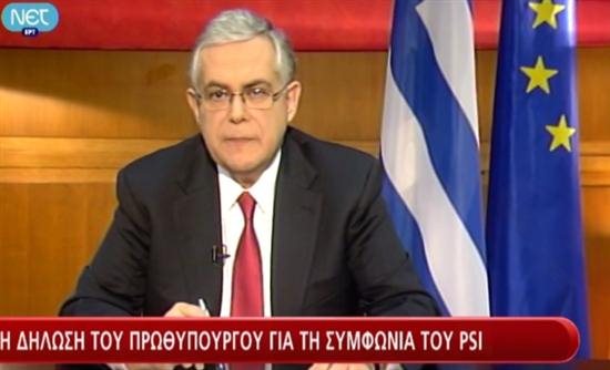 Σε δήλωση του προς τον ελληνικό λαό ο πρωθυπουργός εξέφρασε την ικανοποίηση του για την έκβαση του PSI. Χαρακτήρισε «ιστορική» και «σημαντική» τη σημερινή μέρα για τη χώρα μας, υποστήριξε ότι ξεφύγαμε από την «κινούμενη άμμο» και για πρώτη φορά αφαιρέθηκε χρέος.