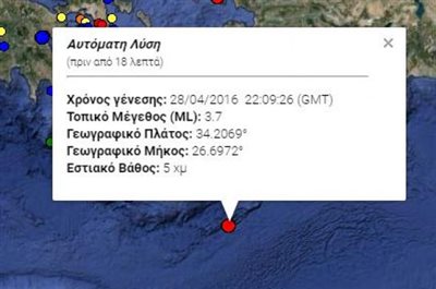 Συγκεκριμένα, η δόνηση σημειώθηκε βάσει της προκαταρτικής λύσης του Γεωδυναμικού Ινστιτούτου του Αστεροσκοπείου Αθηνών στις 1.09.26. Ήταν υποθαλάσσια και 3,7 βαθμών της κλίμακας Ρίχτερ σε εστιακό βάθος πέντε χιλιομέτρων.
