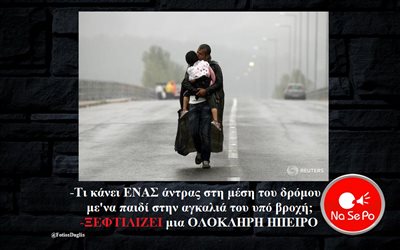 με'να παιδί στην αγκαλιά του υπό βροχή;