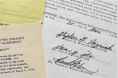 Το καταστατικό που χρονολογείται από το 1976, υπολογιζόταν ότι άξιζε περίπου 100.000-150.000 δολάρια, ωστόσο ο αγοραστής του, Εντουάρντο Κισνέρος, επικεφαλής της Κισνέρος Κορπορέισιον, έδωσε για να το αποκτήσει ποσό δεκαπλάσιο.«Είμαι πολύ χαρούμενος να κρατάω στα χέρια μου ένα κομμάτι της αμερικάνικης και όχι μόνο ιστορίας» ήταν το σχόλιο του αγοραστή στο λογαριασμό του στο twitter. Τα έγραφα που αγόρασε περιλαμβάνουν το καταστατικό ίδρυσης της Apple, το οποίο και υπογράφουν οι Στίβ Γόζνιακ και Στιβ Τζομπς, καθώς και μια δήλωση αποχώρησης του Ρόναλντ Γουέιν, με βάση την οποία παραιτήθηκε από το ποσοστό 10% που διέθετε στην εταιρεία έναντι ποσού μόλις 800 δολαρίων... newsbomb.gr