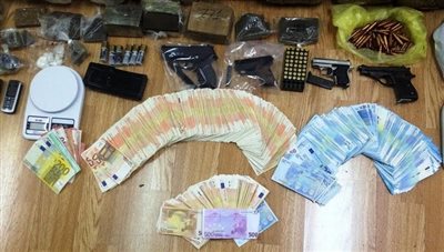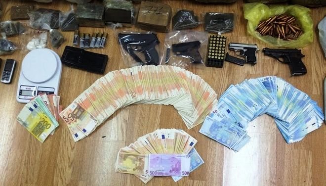 Επίσης κατασχέθηκαν 62.255 ευρώ και 50 δολαρία ΗΠΑ, καθώς επίσης ένα Καλάσνικοφ, δύο πιστόλια, πιστόλι κρότου, ένα αεροβόλο πιστόλι, 318 φυσίγγια διαφόρων διαμετρημάτων, πέντε γεμιστήρες διαφόρων όπλων, ένα παραλυτικό σπρέι, πέντε Ι.Χ. αυτοκίνητα, μία μοτοσυκλέτα, 8 ζυγαριές ακριβείας, 28 συσκευές κινητής τηλεφωνίας, ένα Tablet και πλήθος από πλαστά ευρώ.