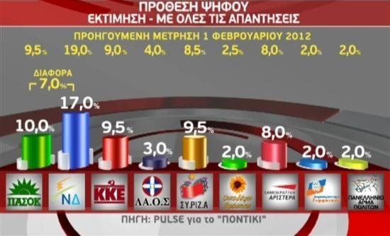 Σύμφωνα με την μέτρηση της εταιρείας pulse για το «Ποντίκι» η ΝΔ συγκεντρώνει 17% το ΠΑΣΟΚ 10%, ΚΚΕ και ΣΥΡΙΖΑ ακολουθούν μαζί με 9,5%, η Δημοκρατική Αριστερά του Φώτη Κουβέλη δείχνει να χάνει έδαφος και να φτάνει το 8%, οι Ανεξάρτητοι Έλληνες του Πάνου Καμμένου συγκεντρώνει 5% η Χρυσή Αυγή 3,5 και ο ΛΑΟΣ 3%.