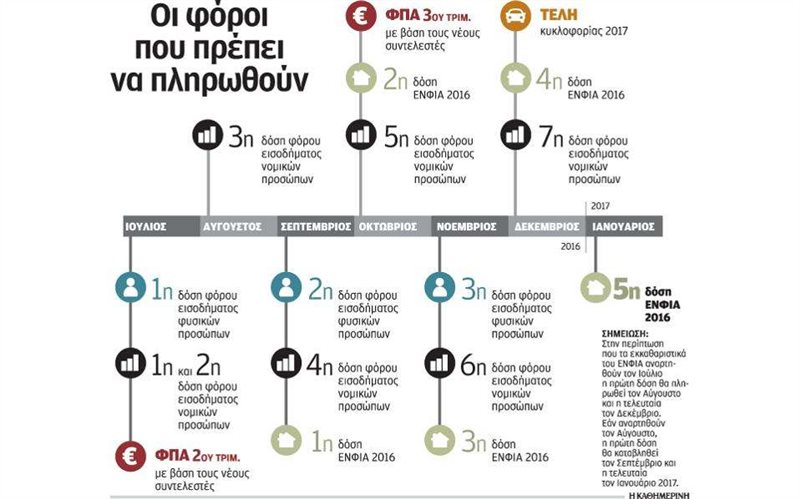 Ο «Γολγοθάς» των φορολογουμένων ξεκινά από τις 29 Ιουλίου όπου πρέπει να καταβληθεί η πρώτη δόση του φόρου εισοδήματος. Από τον Αύγουστο (ή Σεπτέμβριο αναλόγως του πότε θα αναρτηθούν τα εκκαθαριστικά) ξεκινά η πληρωμή του ΕΝΦΙΑ και στο τέλος του έτους οι υπόχρεοι πρέπει να πληρώσουν και τα τέλη κυκλοφορίας.
