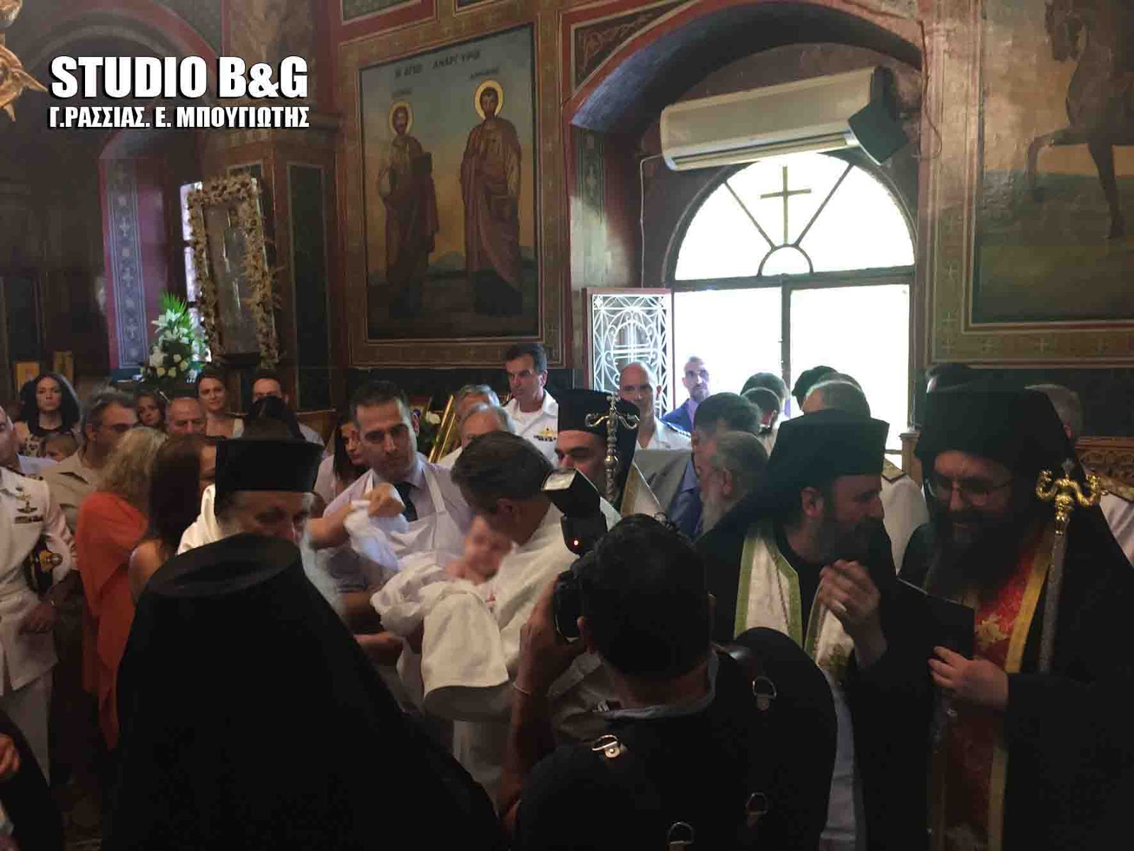 Το αγοράκι βαπτίστηκε στον Ιερό ναό της Παναγίας στην Αρεια Ναυπλίου με νονό τον υπουργό Εθνικής Άμυνας Πάνο Καμμένο. Την βάπτιση τέλεσε ο Μητροπολίτης Αργολίδος Νεκτάριος μαζί με τον θεοφιλέστατο επίσκοπο Επιδαύρου Καλλίνικο. Στην βάπτιση παραβρέθηκαν o Αρχηγός ΓΕΝ Αντιναύαρχος Γεώργιος Γιακουμάκης ΠΝ ,ο Αρχηγός στόλου αντιναύαρχος Κωνσταντίνος Καραγεώργης , οι βουλευτές Αργολίδος Γιάννης Ανδριανός και Γιάννης Μανιάτης , ο δήμαρχος Ναυπλιέων Δημήτρης Κωστούρος αξιωματικοί του Πολεμικού Ναυτικού, φίλοι και συγγενείς. Ο μικρός πήρε το όνομα του αδικοχαμένου πατέρα του!!!Στην βάπτιση παρευρέθηκε και ο γνωστός τραγουδιστής Γιώργος Λεμπέσης «Είμαστε όλοι οικογένειά του, όλες οι Ένοπλες Δυνάμεις, το Πολεμικό Ναυτικό, αλλά και όλος ο ελληνικός λαός, γιατί είναι ένα παιδί το οποίο ανήκει στην Ελλάδα», δήλωσε ο υπουργός Εθνικής Άμυνας Πάνος Καμμένος μετά την ολοκλήρωση του μυστηρίου, ευχόμενος στη μητέρα και τον αδελφό του υποπλοιάρχου να μπορέσουν να ανταπεξέλθουν σε αυτόν τον μεγάλο χαμό. argolikeseidhseis