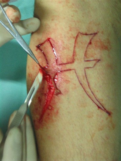Αυτός θα πάρει ένα κοφτερό νυστέρι και διάφορα μικροσκοπικά καλοτροχισμένα μαχαιράκια και θα έρθει… απειλητικά προς το μέρος σας! Θα κόψει το δέρμα σας σε διάφορα σημεία, ανάλογα με το σχέδιο που θέλετε να αποτυπωθεί, και θα σας στείλει στο σπίτι για ανάρρωση! Ο σκοπός είναι να δημιουργηθούν καλοσχηματισμένες ουλές, οι οποίες θα μείνουν εκεί… για πάντα!