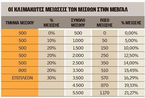 Τα επιπλέον πέραν των 3.300 ευρώ και μέχρι το σύνολο του μισθού μειώνονται κατά 30%.