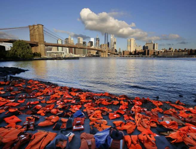 Καθώς το μεταναστευτικό-προσφυγικό είναι ένα από τα βασικά θέματα που θα απασχολήσουν την ατζέντα της γενικής συνέλευσης η οργάνωση επέλεξε να γεμίσει μια από τις παραλίες της Νέας Υόρκης κάτω από τη γέφυρα του Μπρούκλιν με σωσίβια.