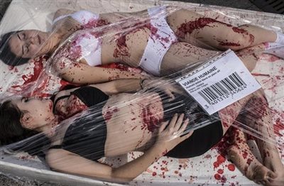 “Θέλουμε να υπενθυμίσουμε τα πτώματα που βάζουν στο στόμα οι άνθρωποι, στο όνομα της γαστρονομικής απόλαυσης” είπαν οι ακτιβιστές που θέλησαν να τονίσουν την αγριότητα στη βιομηχανία κρέατος υπερασπιζόμενοι την χορτοφαγία με αιματηρό, σχεδόν απεχθή τρόπο.