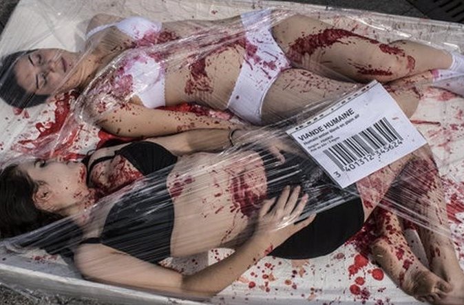 Ορκισμένοι στον αγώνα κατά της κακοποίησης της ζώων και της κατανάλωσης ζωϊκού κρέατος ή άλλων προϊόντων ζωικής προέλευσης οι ακτιβιστές ήταν “αιμόφυρτοι” με ταμπέλες στα αυτιά τους καθώς πόζαραν σαν σφαγμένα ζώα στην πλατεία της Πόλης του Φωτός.
