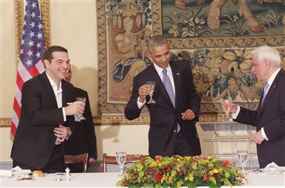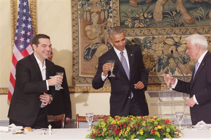 Το δείπνο που παρέθεσε ο Προκόπης Παυλόπουλος προς τιμήν του Μπάρακ Ομπάμα ολοκληρώθηκε γύρω στις 9.30 το βράδυ με το μενού να περιλαμβάνει γαρίδες με ρύζι, σφυρίδα και γλυκό κάστανο. Παιδική χορωδία της λυρικής σκηνής τραγούδησε Μίκη Θεοδωράκη και Μάνο Χατζηδάκι, αλλά και το “Imagine” του Τζον Λένον. Ο Αμερικανός πρόεδρος ενθουσιάστηκε και έσπευσε να φωτογραφηθεί μαζί τους , ενώ σύμφωνα με πληροφορίες δεν «χάλασε το χατίρι» για φωτογραφίες ούτε στην υπουργό Τουρισμό Έλενα Κουντουρά, αλλά ούτε σε συνεργάτες του πρωθυπουργού.