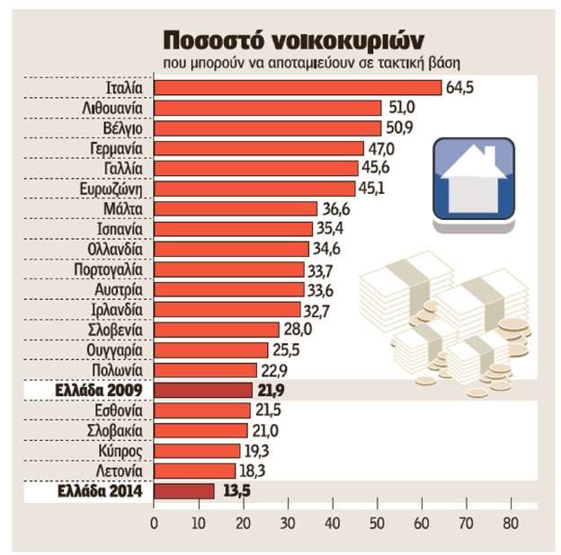Όπως προκύπτει από την Έρευνα Χρηματοδότησης και Κατανάλωσης Νοικοκυριών που διενεργεί περιοδικά για όλες τις χώρες της ευρωζώνης η Ευρωπαϊκή Κεντρική Τράπεζα, η ύφεση από το 2009 και μετά έχει αφήσει το αποτύπωμά της τόσο στο κοινωνικό όσο και στο οικονομικό προφίλ των νοικοκυρών. Μέσα σε μία πενταετία, από το 2009 ως και το 2014 αυξήθηκε σημαντικά το ποσοστό των νοικοκυριών με 1-2 άτομα και μειώθηκε αντίστοιχα το ποσοστό των νοικοκυριών με 3-4 άτομα, χωρίς πάντως να έχουμε προσεγγίσει τα μέσα ποσοστά της Ευρωζώνης, όπου είναι μεγαλύτερη η τάση να ζει κανείς μόνος του ή σε ζευγάρι. Το 72% των ελληνικών νοικοκυριών διαθέτει ιδιόκτητο σπίτι και από αυτούς το 16% έχει στεγαστικό δάνειο, έναντι 61,2% και 32% αντίστοιχα των μέσων όρων της Ευρωζώνης.