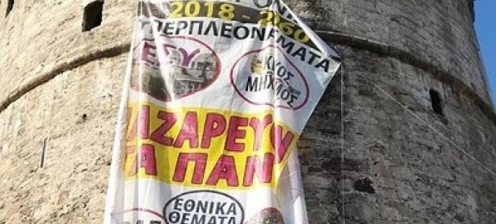 Εργαζόμενοι στα νοσοκομεία σήκωσαν πανό στον Λευκό Πύργο -Για την παραχώρηση στο Υπερταμείο