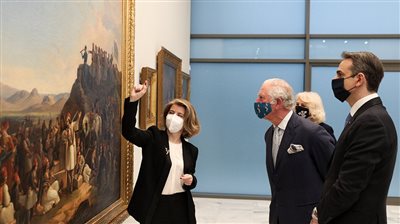 Λίγο μετά τις 18.30 ξεκίνησε η ξενάγηση των υψηλών προσκεκλημένων, σε πέντε διαφορετικά γκρουπ, οι οποίοι θα περιηγήθηκαν, για είκοσι περίπου λεπτά, κάποιους από τους εντυπωσιακούς νέους χώρους της Εθνικής Πινακοθήκης και θαύμασαν από κοντά έργα εμπνευσμένα από την Ελληνική Επανάσταση, τα οποία εκτίθενται σε μια ειδική αίθουσα του πρώτου ορόφου, με κορυφαία τα «Ελλάς ευγνωμονούσα» του Θεόδωρου Βρυζάκη, «Έλληνας Καβαλάρης» του Ευγένιου Ντελακρουά, «Εξοδος του Μεσολογγίου», «Υποδοχή του Λόρδου Βύρωνα στο Μεσολόγγι» κ.α. Παράλληλα στάθηκαν ενώπιον αριστουργημάτων σπουδαίων Ελλήνων ζωγράφων όπως τα «Ιδού ο Νυμφίος έρχεται» και «Εαρινή Συμφωνία» του Νικόλαου Γύζη, «Χριστός-Ανθρωπότης» του Κωνσταντίνου Παρθένη, «Στην ταράτσα ή Αθηναϊκή βραδιά» του Ιάκωβου Ρίζου που απαθανατίζει ένα αξιωματικό του Ναυτικού που εικάζεται πως είναι ο πρίγκιπας Ανδρέας της Ελλάδος, παππούς του Πρίκγιπα Κάρολου.