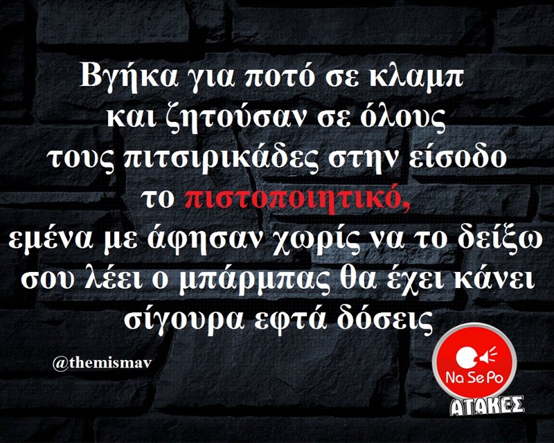 κλαμπ και ζητούσαν σε όλους τους πιτσιρικάδες στην είσοδο το πιστοποιητικό, εμένα με άφησαν χωρίς να το δείξω σου λέει ο μπάρμπας θα έχει κάνει σίγουρα εφτά δόσεις @themismav