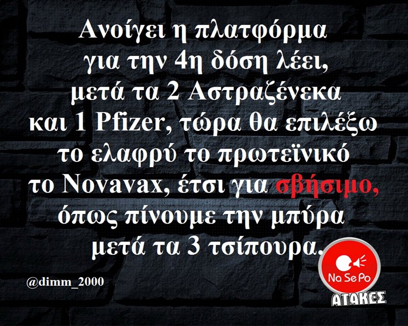 πλατφόρμα για την 4η δόση λέει, μετά τα 2 Αστραζένεκα και 1 Pfizer, τώρα θα επιλέξω το ελαφρύ το πρωτεϊνικό το Novavax, έτσι για σβήσιμο, όπως πίνουμε την μπύρα μετά τα 3 τσίπουρα. @dimm_2000