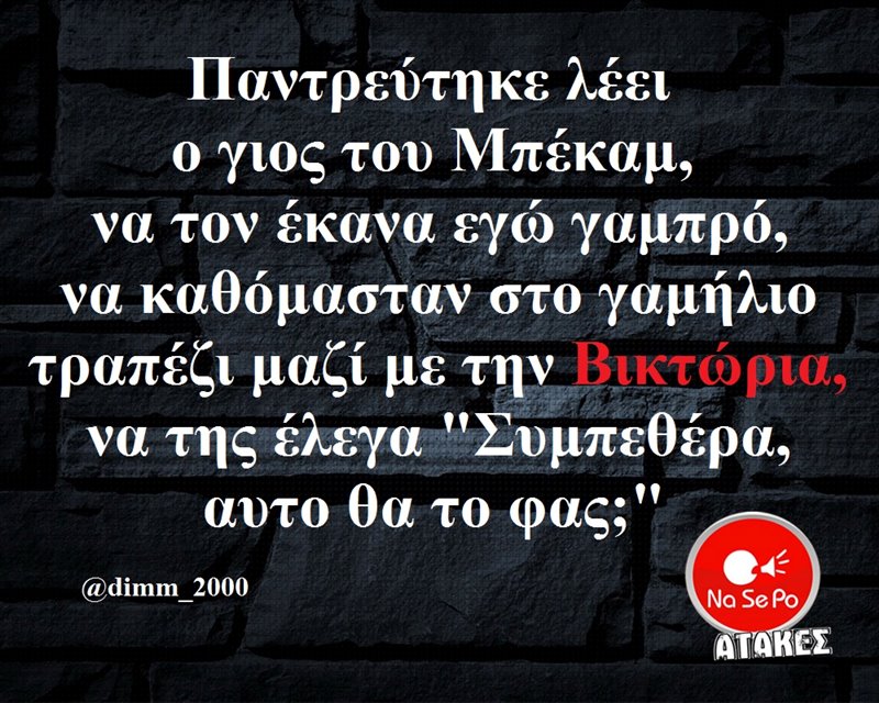 Παντρεύτηκε λέει ο γιος του Μπέκαμ, να τον έκανα εγώ γαμπρό, να καθόμασταν στο γαμήλιο τραπέζι μαζί με την Βικτώρια, να της έλεγα “Συμπεθέρα, αυτό θα το φας;” @dimm_2000