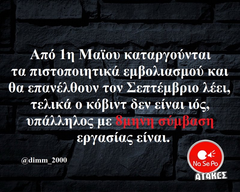 καταργούνται τα πιστοποιητικά εμβολιασμού και θα επανέλθουν τον Σεπτέμβριο λέει, τελικά ο κόβιντ δεν είναι ιός, υπάλληλος με 8μηνη σύμβαση εργασίας είναι. @dimm_2000