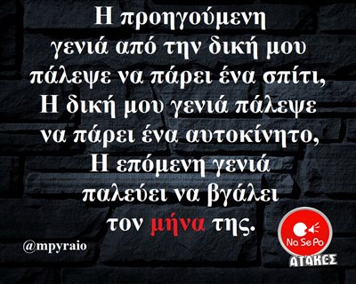 Η προηγούμενη γενιά από την δική μου πάλεψε να πάρει ένα σπίτι. Η δική μου γενιά πάλεψε να πάρει ένα αυτοκίνητο. Η επόμενη γενιά παλεύει να βγάλει τον μήνα της. @mpyraio