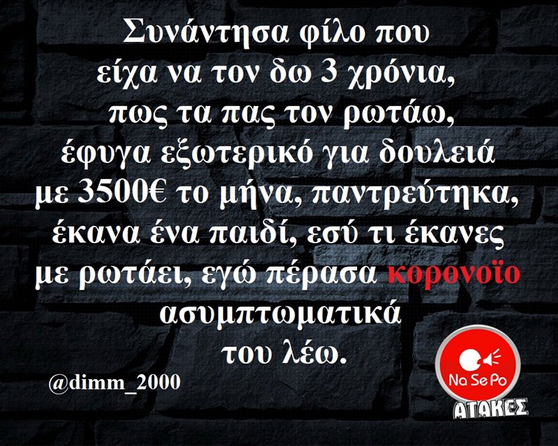 που είχα να τον δω 3 χρόνια, πως τα πας τον ρωτάω, έφυγα εξωτερικό για δουλειά με 3500€ το μήνα, παντρεύτηκα, έκανα ένα παιδί, εσύ τι έκανες με ρωτάει, εγώ πέρασα κορονοϊό ασυμπτωματικά του λέω. @dimm_2000