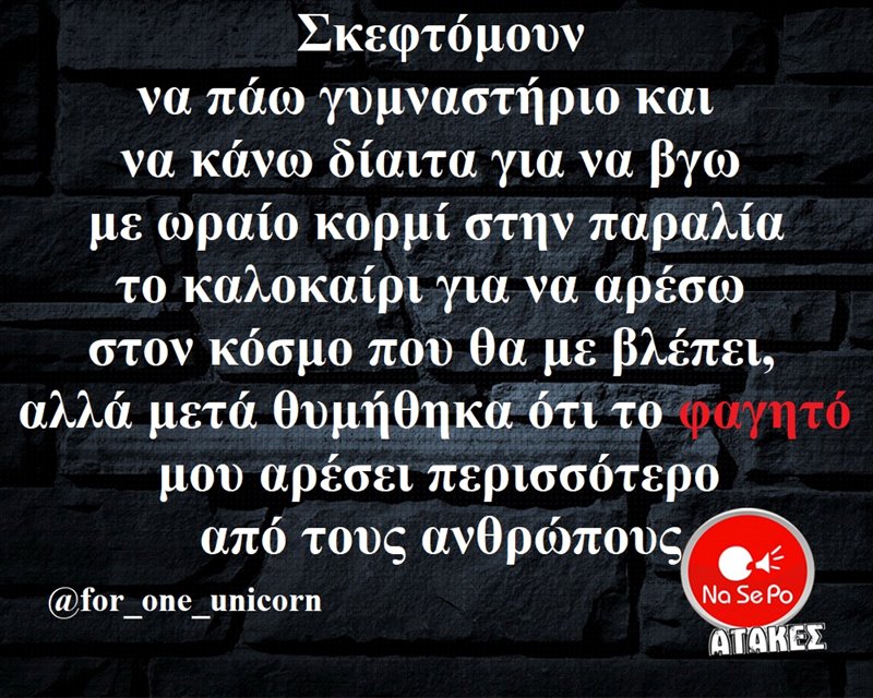 Σκεφτόμουν να πάω γυμναστήριο και να κάνω δίαιτα για να βγω με ωραίο κορμί στην παραλία το καλοκαίρι για να αρέσω στον κόσμο που θα με βλέπει, αλλά μετά θυμήθηκα ότι το φαγητό μου αρέσει περισσότερο από τους ανθρώπους @for_one_unicorn