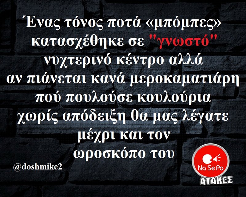 Ένας τόνος ποτά «μπόμπες» κατασχέθηκε σε “γνωστό” νυχτερινό κέντρο αλλά αν πιάνεται κανά μεροκαματιάρη πού πουλούσε κουλούρια χωρίς απόδειξη θα μας λέγατε μέχρι και τον ωροσκόπο του @doshmike2