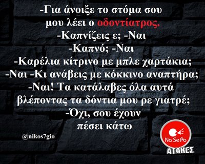 -Για άνοιξε το στόμα σου μου λέει ο οδοντιάτρος. -Καπνίζεις ε; - Ναι -Καπνός; -Ναι -Καρέλια κίτρινο με μπλε χαρτάκια; -Ναι – Κι ανάβεις με κόκκινο αναπτήρα; -Ναι! Τα κατάλαβες όλα αυτά βλέποντας τα δόντια μου ρε γιατρέ; -Όχι, σου έχουν πέσει κάτω @nikos7gio