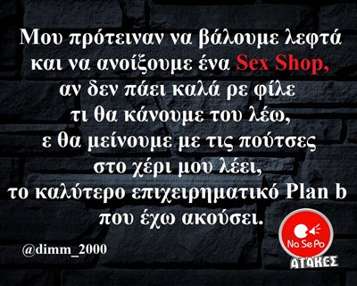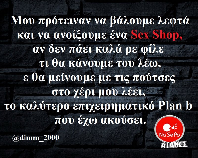 βάλουμε λεφτά και να ανοίξουμε ένα Sex Shop, αν δεν πάει καλά ρε φίλε τι θα κάνουμε του λέω, ε θα μείνουμε με τις πούτσες στο χέρι μου λεει, το καλύτερο επιχειρηματικό Plan b που έχω ακούσει. @dimm_2000