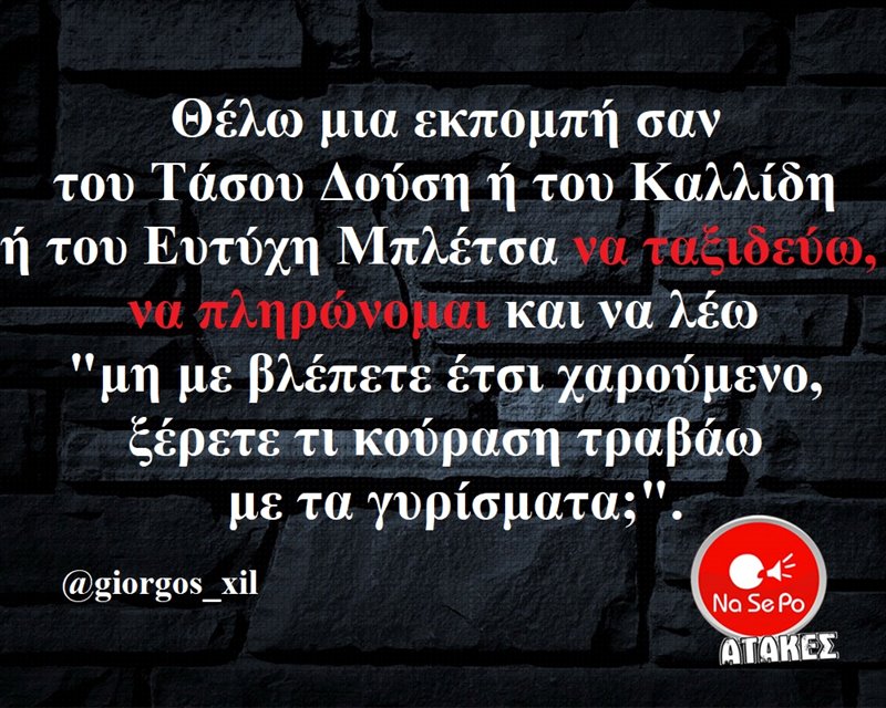 σαν του Τάσου Δούση ή του Καλλίδη ή του Ευτύχη Μπλέτσα να ταξιδεύω, να πληρώνομαι και να λέω "μη με βλέπετε έτσι χαρούμενο, ξέρετε τι κούραση τραβάω με τα γυρίσματα;" @giorgos_xil