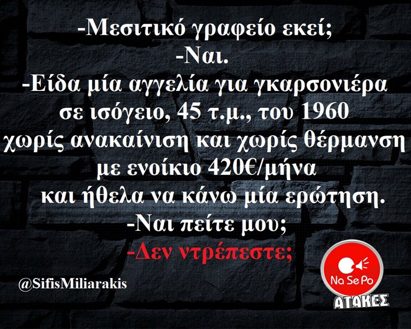 εκεί; -Ναι. -Είδα μία αγγελία για γκαρσονιέρα σε ισόγειο, 45 τ.μ., του 1960 χωρίς ανακαίνιση και χωρίς θέρμανση με ενοίκιο 420€/μήνα και ήθελα να κάνω μία ερώτηση. -Ναι πείτε μου;