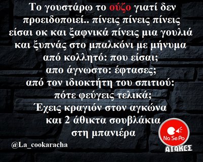 Το γουστάρω το ούζο γιατί δεν προειδοποιεί... πίνεις πίνεις πίνεις είσαι οκ και ξαφνικά πίνεις μια γουλιά και ξυπνάς στο μπαλκόνι με μήνυμα από κολλητό: που είσαι; από άγνωστο: έφτασες; από τον ιδιοκτήτη του σπιτού: πότε φεύγεις τελικά; Έχειις κραγιόν στον αγκώνα και 2 άθικτα σουβλάκια στη μπανιέρα @La_cookaracha