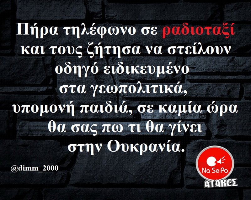 Πήρα τηλέφωνο σε ραδιοταξί και τους ζήτησα να στείλουν οδηγό ειδικευμένο στα γεωπολιτικά, υπομονή παιδιά, σε καμιά ώρα θα σας πω τι θα γίνει στην Ουκρανία. @dimm_2000