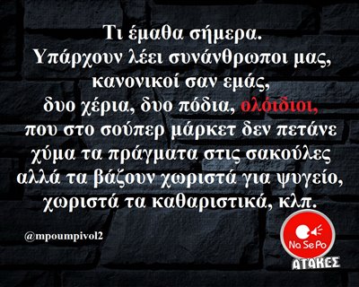 Τι έμαθα σήμερα. Υπάρχουν λέει συνάνθρωποι μας, κανονικοί σαν εμάς, δυο χέρια, δυο πόδια, ολόιδιοι, που στο σούπερ μάρκετ δεν πετάνε χύμα τα πράγματα στις σακούλες αλλά τα βάζουν χωριστά για ψυγείο, χωριστά τα καθαριστικά, κλπ. @mpoumpivol2