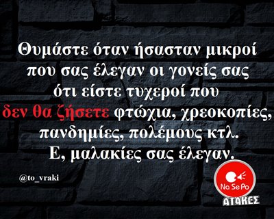 δεν θα ζήσετε φτώχια, χρεοκοπίες, πανδημίες, πολέμους κτλ. Ε, μαλακίες σα έλεγαν. @to_vraki
