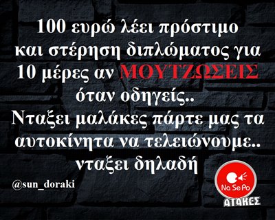 πρόστιμο και στέρηση διπλώματος για 10 μέρες αν ΜΟΥΤΖΩΣΕΙΣ όταν οδηγείς... Ντάξει μαλάκες πάρτε μας τα αυτοκίνητα να τελειώνουμε... ντάξει δηλαδή @sun_doraki