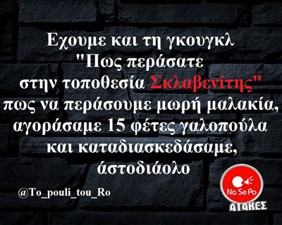 γκουγκλ "Πως περάσατε στην τοποθεσία Σκλαβενίτης" πως να περάσουμε μωρή μαλακία, αγοράσαμε 15 φέτες γαλοπούλα και καταδιασκεδάσαμε, άστοδιάολο @To_pouli_tou_Ro