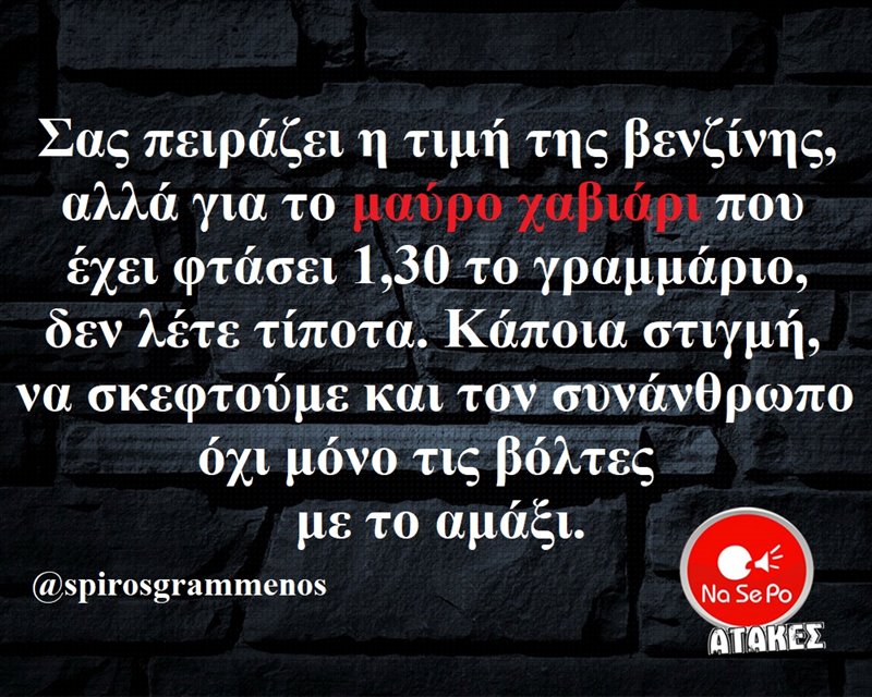 τιμή της βενζίνης, αλλά για το μαύρο χαβιάρι που έχει φτάσει 1,30 το γραμμάριο, δεν λέτε τίποτα. Κάποια στιγμή, να σκεφτούμε και τον συνάνθρωπο όχι μόνο τις βόλτες με το αμάξι. @spirosgrammenos