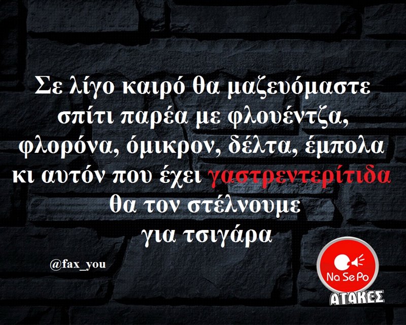 μαζευόμαστε σπίτι παρέα με φλουέντζα, φλορόνα, όμικρον, δέλτα, έμπολα κι αυτόν που έχει γαστρεντερίτιδα θα τον στέλνουμε για τσιγάρα @fax_you
