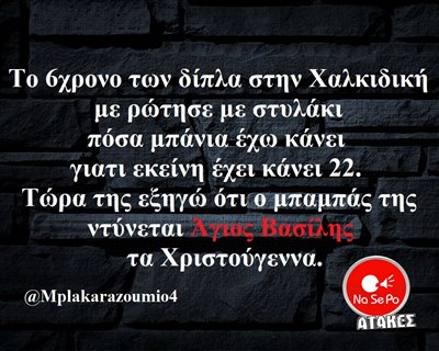 δίπλα στην Χαλκιδική με ρώτησε με στυλάκι πόσα μπάνια έχω κάνει γιατί εκείνη έχει κάνει 22. Τώρα της εξηγώ ότι ο μπαμπάς της ντύνεται Άγιος Βασίλης τα Χριστούγεννα. @Mplakarazoumio4