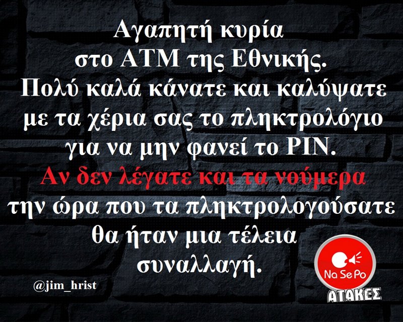 Αγαπητή κυρία στο ΑΤΙΜ της Εθνικής. Πολύ καλά κάνατε και καλύψατε με τα χέρια σας το πληκτολόγιο για να μην φανεί το PIN. Αν δεν λέγατε και τα νούμερα