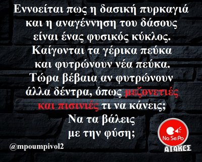 δασική πυρκαγιά και η αναγέννηση του δάσος είναι ένας φυσικός κύκλος. Καίγονται τα γέρικα πεύκα και φυτρώνουν νέα πεύκς. Τώρα βέβαια αν φυτρώνουν άλλα δέντρα, όπως μεζονετιές και πισινιές τι να κάνεις; Να τα βάλεις με την φύση; @mpoumpivol2