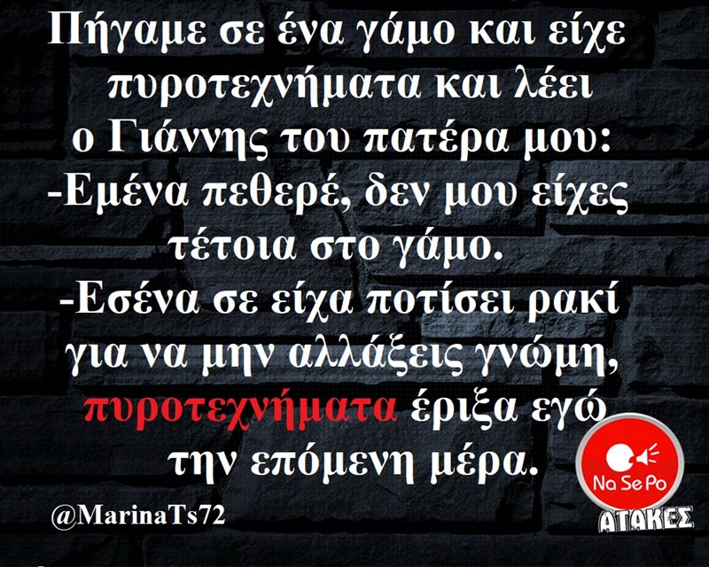 γάμο και είχε πυροτεχνήματα και λέει ο Γιάννης του πατέρα μου: -Εμένα πεθερέ, δεν μου είχες τέτοια στο γάμο. -Εσένα σε είχα ποτίσει ρακί για να μην αλλάξεις γνώμη,