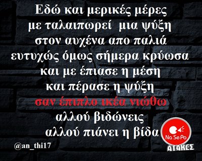 μέρες με ταλαιπωρεί μια ψύξη στον αυχένα από παλιά ευτυχώς όμως σήμερα κρύωσα και με έπιασε η μέση και πέρασε η ψύξη