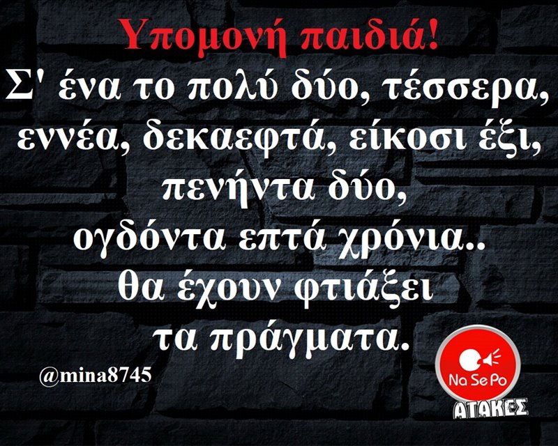 Υπομονή παιδιά! Σ' ένα το πολύ δύο, τέσσερα, εννέα, δεκαεφτά, είκοσι έξι, πενήντα δύο, ογδόντα επτά χρόνια... θα έχουν φτιάξει τα πράγματα. @mina8745