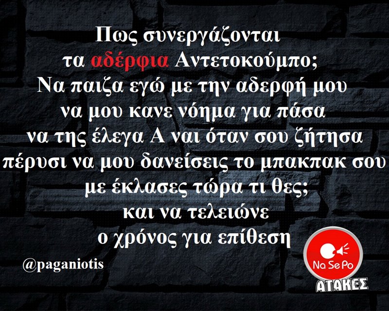 Πως συνεργάζονται τα αδέρφια Αντετοκούμπο: Να παιζα εγώ με την αδερφή μου να μου κανε νόημα για πάσα να της έλεγα Α ναι όταν σου ζήτησα πέρυσι να μου δανείσεις το μπακπακ σου με έκλασες τώρα τι θες; και να τελειώνε ο χρόνος για επίθεση @paganiotis