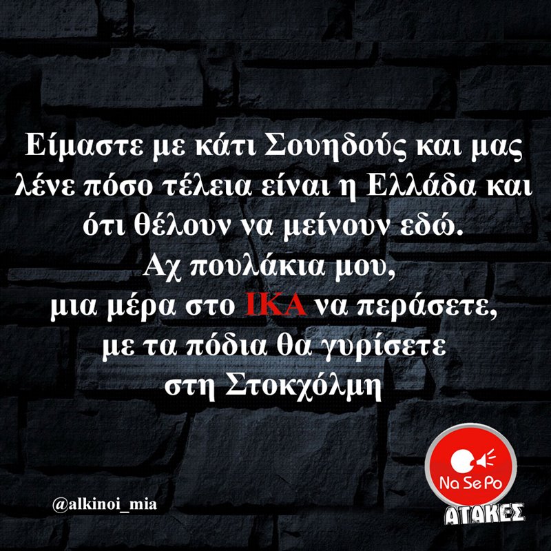 και μας λένε πόσο τέλεια είναι η Ελλάδα και ότι θέλουν να μείνουν εδώ. Αχ πουλάκια μου, μια μέρα στο ΙΚΑ να περάσετε, με τα πόδια θα γυρίσετε στη Στοκχόλμη @alkinoi_mia