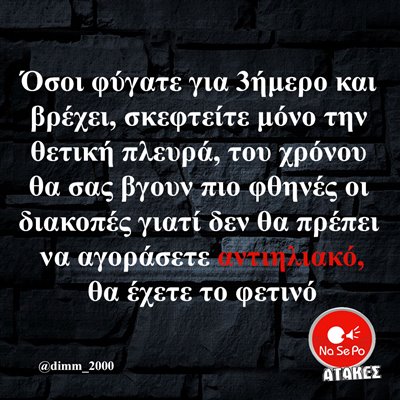 3ήμερο και βρέχει, σκεφτείτε μόνο την θετική πλευρά, του χρόνου θα σας βγουν πιο φθηνές οι διακοπές γιατί δεν θα πρέπει να αγοράσετε αντηλιακό, θα έχετε το φετινό @dimm_2000